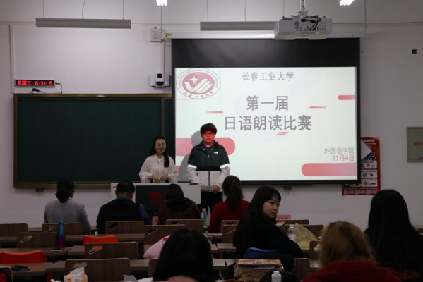 社团联合会主办的“第一届日语朗读比赛”在北湖东区教学主楼450教室举行。日语系主任曾妍,教师宋卓时、王佳璐、何微、龙慧星出席比赛并担任评委,学生金勋、斯日格担任主持人, 2019级日语专业学生36人参赛。