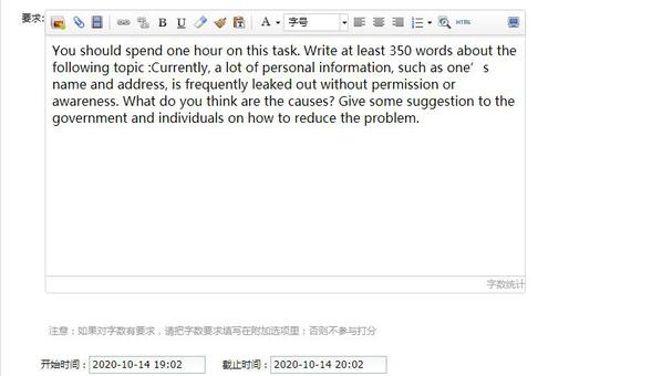 公共外语教学部和英语系的精心组织下,在全院外语教师的大力宣传下,我校学生积极踊跃报名参赛,1365名学生报名参加阅读比赛,1007名学生报名参加写作比赛,196名学生报名参加演讲比赛。因受疫情影响,阅读校级初赛于2020年10月10日在雨课堂进行;写作校级初赛于2020年10月14日使用批改网+教师人工阅进行;演讲校级初赛于2020年10月13日在北湖东区主楼海棠书屋