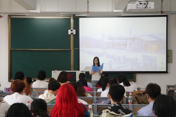第一轮比赛是俄语朗读大赛,共40位参赛选手参加。选手按照抽签顺序依次上台,以配乐PPT作为背景朗诵俄语诗歌。表演的同时,由评委老师根据选手的语音语调、配乐效果、舞台表现以及情感呈现等进行评分。核分小组计算平均分,并进行获奖选手排名。
