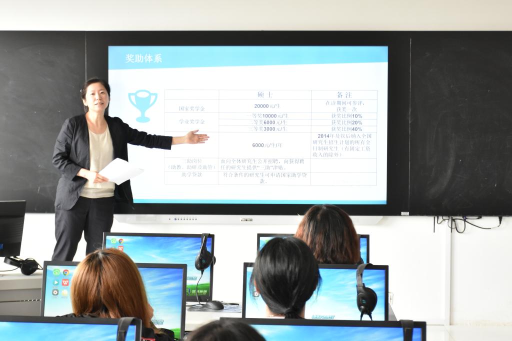 院长王军、副院长刘艳、英语系主任裴佩和日语系主任贺立杰给予了热情的接待,该校英语系和日语系有考研意向的同学聆听了宣讲会。