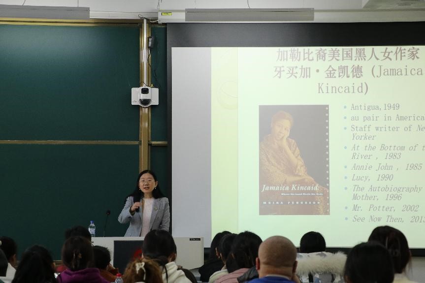 报告会上,张宏薇教授为师生介绍了加勒比裔美国黑人女作家牙买加·金凯德以及她的回忆自传体小说《我母亲的自传》。张教授用生动形象的语言为师生讲解了主人公雪拉的“愤怒”和其多重的文化身份,并指出:殖民压迫是主人公雪拉“愤怒”的直接源头,父权压迫是其“愤怒”的催化剂,而愤怒与对抗是金凯德政治书写的突出特色。张教授认为,《我母亲的自传》是金凯德式的“政治文本”。在这部小说中,金凯德以当代文学中最鲜活、动人的文字写出了最痛彻的“殖民之恨”,从多重“他者”的视角,以一位加勒比知识分子的坦诚和勇气,逆写了殖民主义话语。