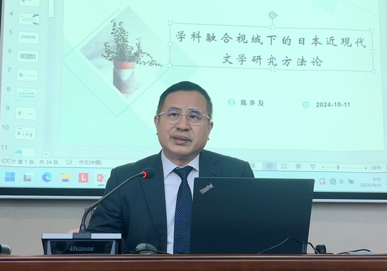 名师大讲堂系列讲座在北湖东区教学主楼435报告厅顺利举行。本次讲座在校科研处的大力支持下,特邀了广东外语外贸大学东方学研究院院长、教育部高等学校外国语言文学类教学指导委员会日语分委员会委员、中国日语教学研究会会长陈多友教授担任主讲嘉宾,主题为“学科融合视域下的日本文学研究方法论”。学院党委书记张子宇、院长王轶、副院长李秀文、部分日语专业教师和海棠书屋