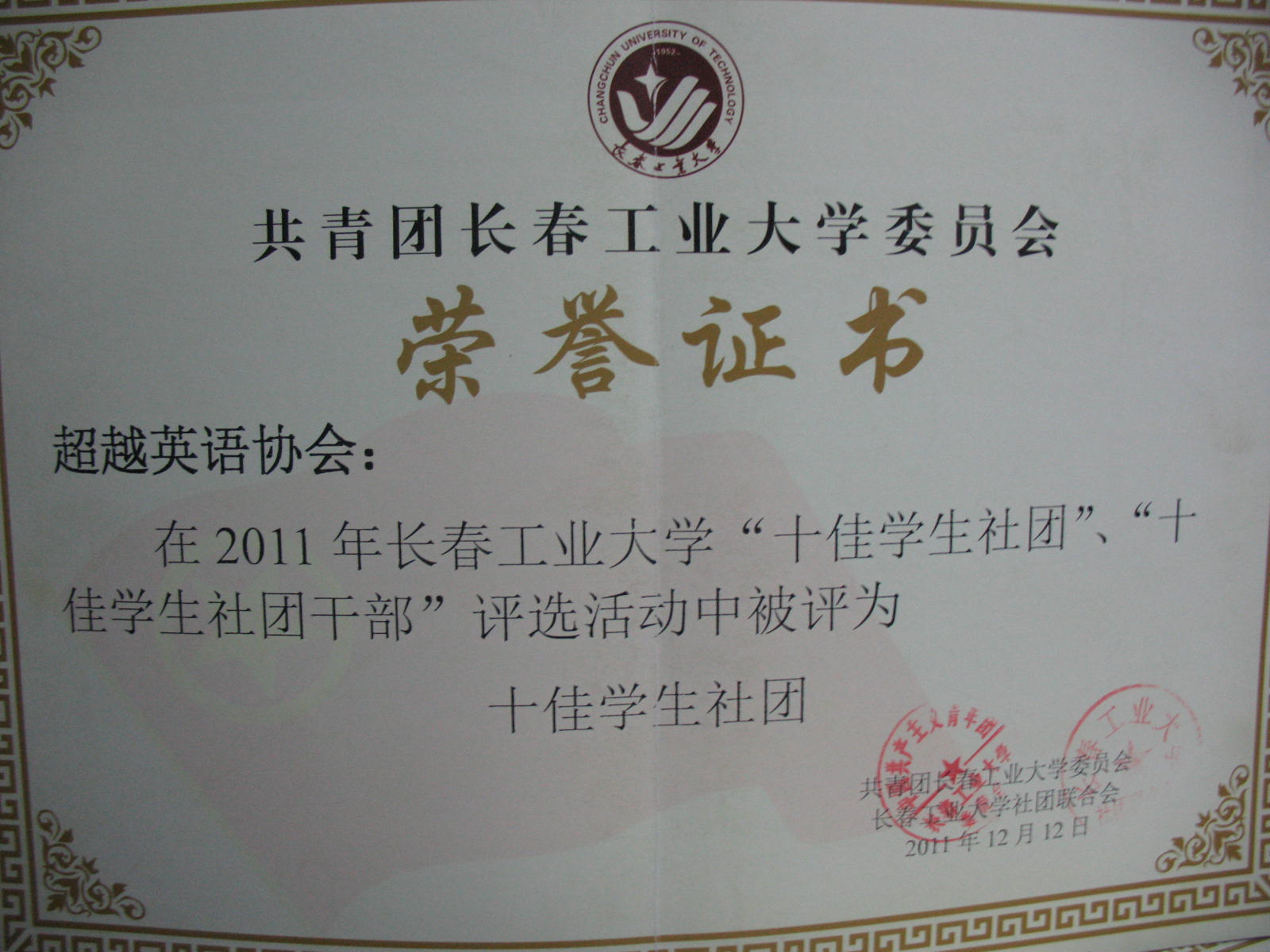 “十佳学生社团”、“十佳学生社团干部”评选中获得“十佳学生社团”称号