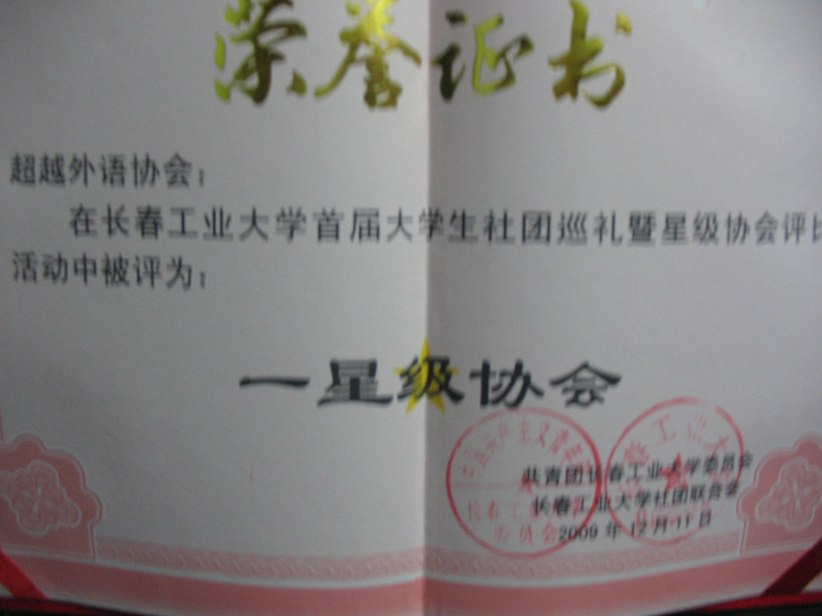 在第一届“皓月杯”英语演讲比赛歌咏比赛中获得优秀 奖 2006年6月 超越外语俱乐部在05-06年度海棠书屋