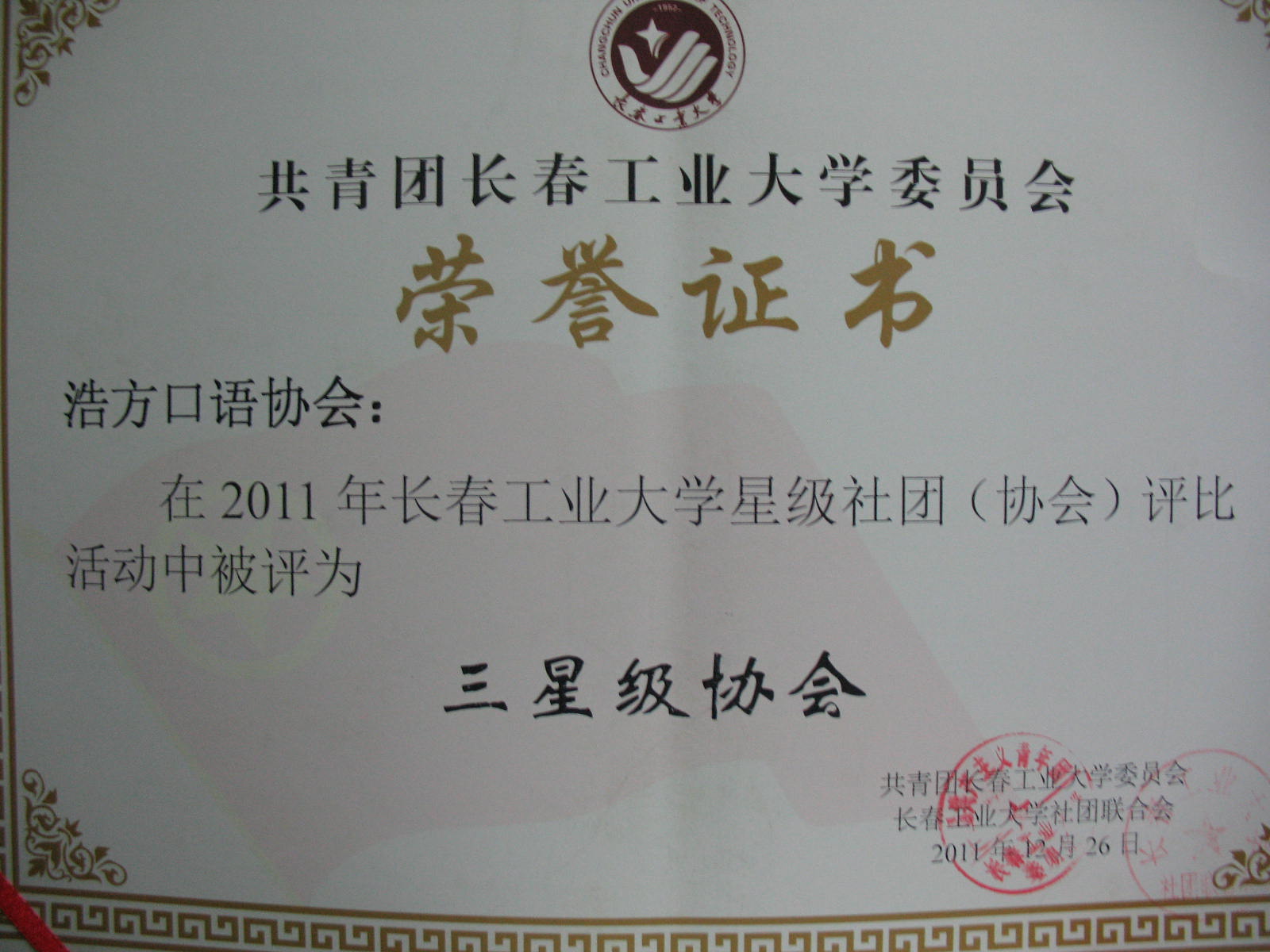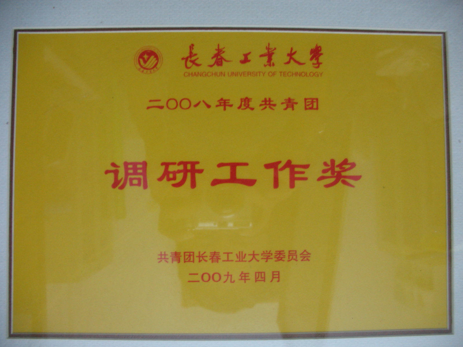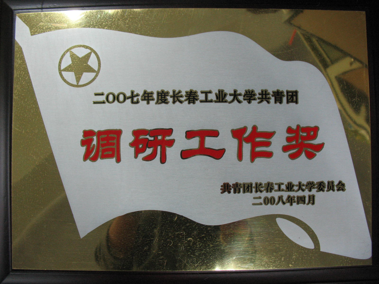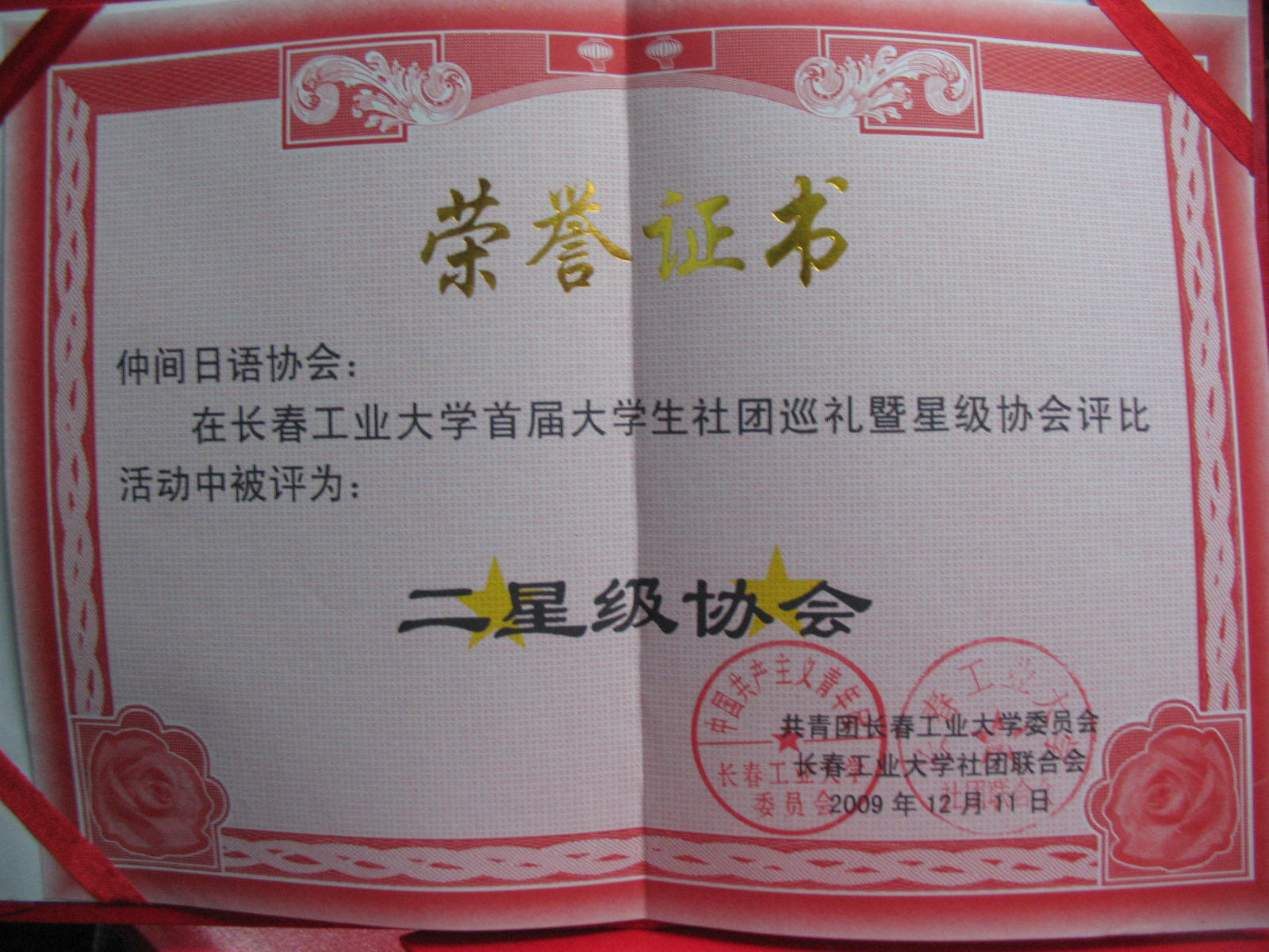 获得建设“平安工大”普及安全教育先进单位 2005年10月 获得由吉林省人民对外友好协会和吉林省翻译工作者协会联 和主办的第二届育英杯日语演讲比赛歌咏竞赛优秀奖 2005年5月 在04-05学年第二学期《团内信息》工作中被评为先进单位 2004年11月 海棠书屋