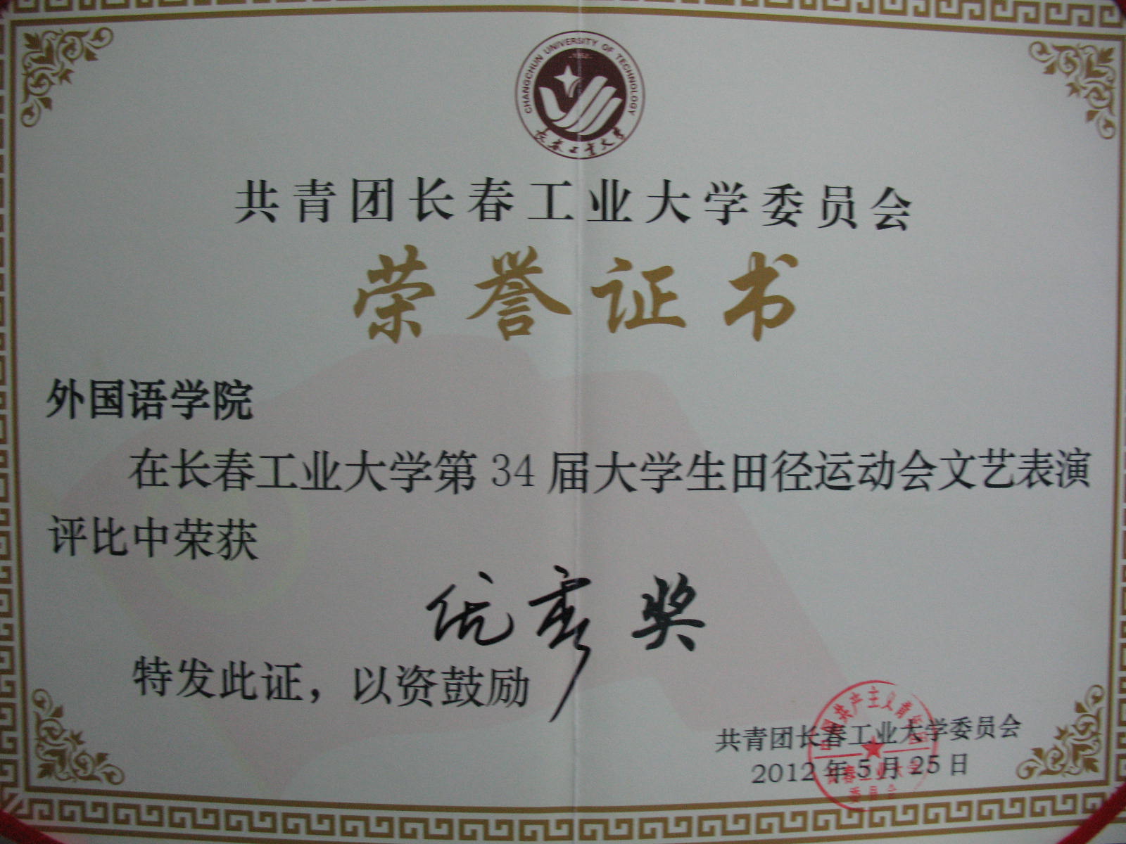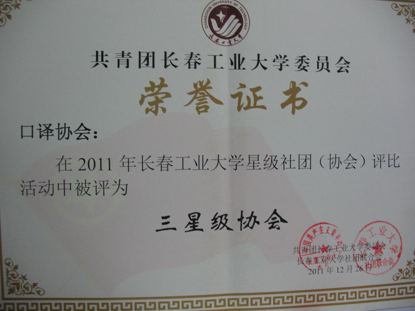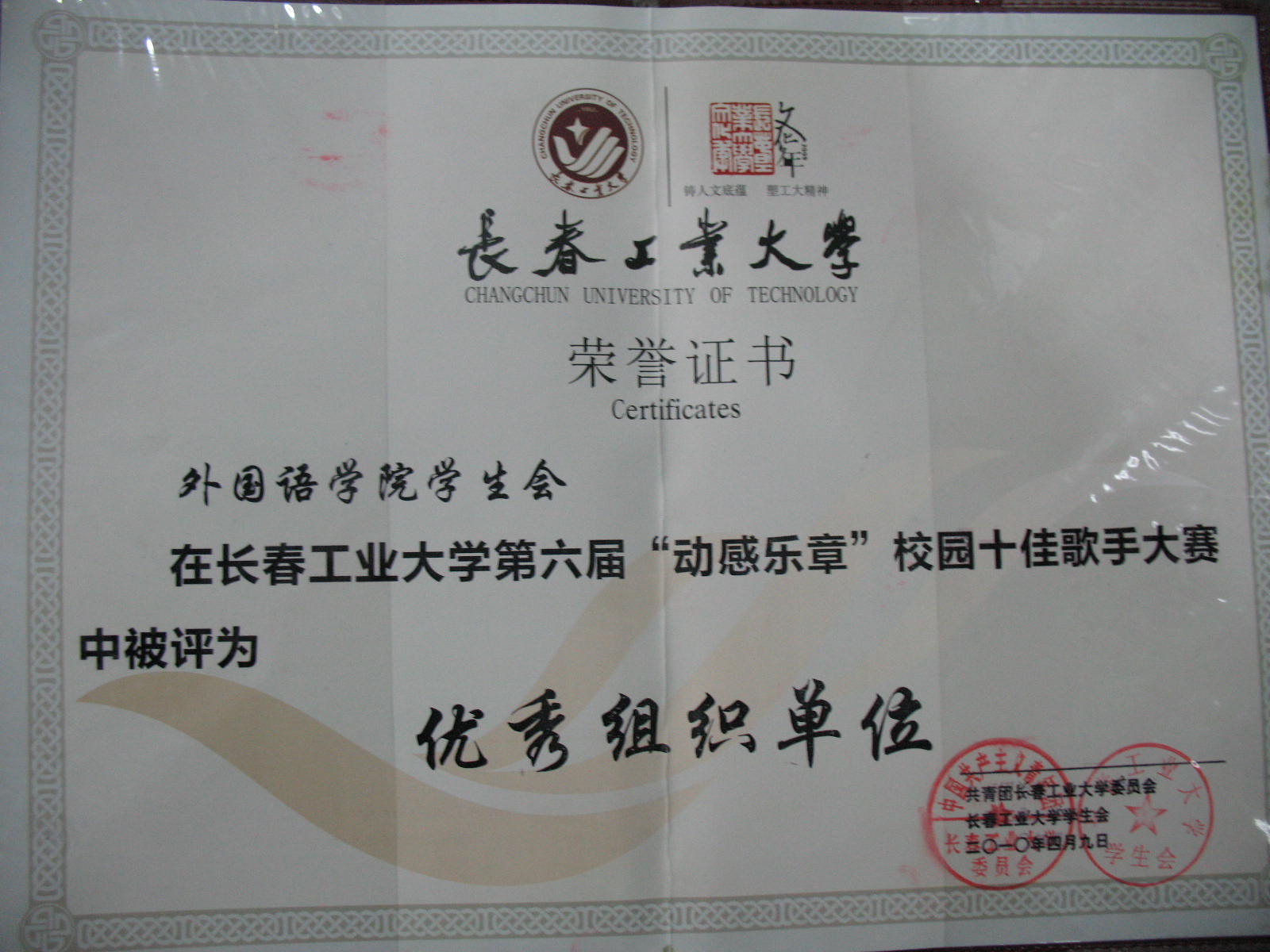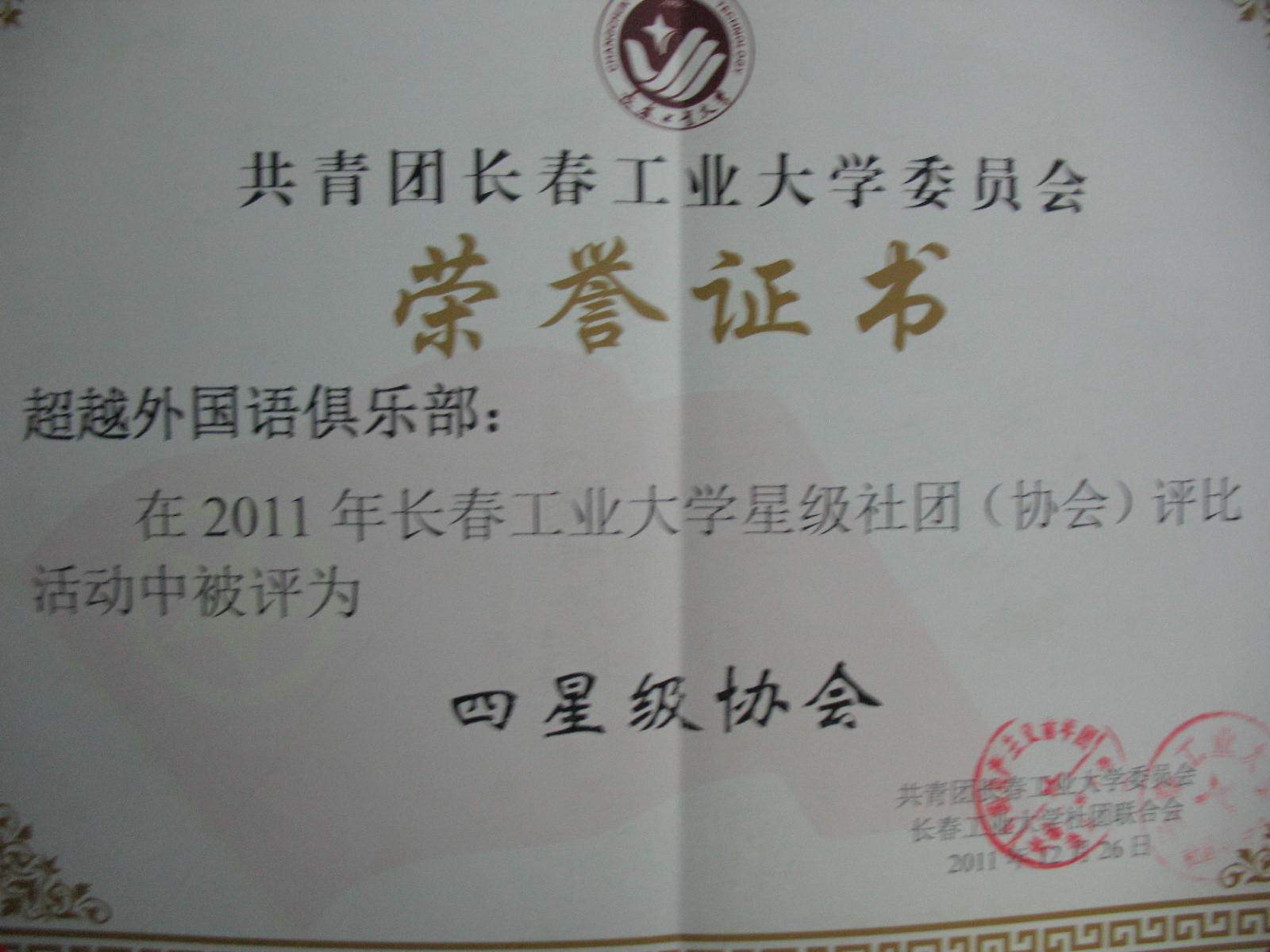 获得建设“平安工大”普及安全教育先进单位 2005年10月 获得由吉林省人民对外友好协会和吉林省翻译工作者协会联 和主办的第二届育英杯日语演讲比赛歌咏竞赛优秀奖 2005年5月 在04-05学年第二学期《团内信息》工作中被评为先进单位 2004年11月 海棠书屋