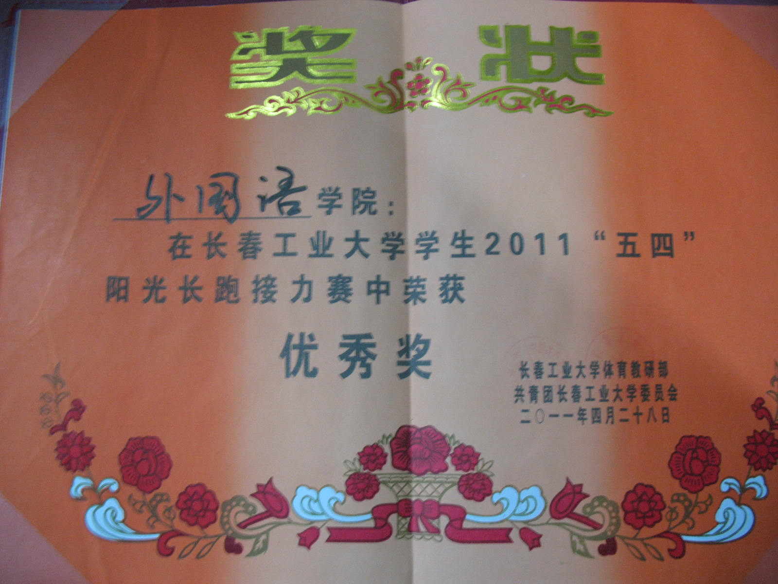 学生2011“五四”阳光长跑接力赛中荣获“优秀奖”。