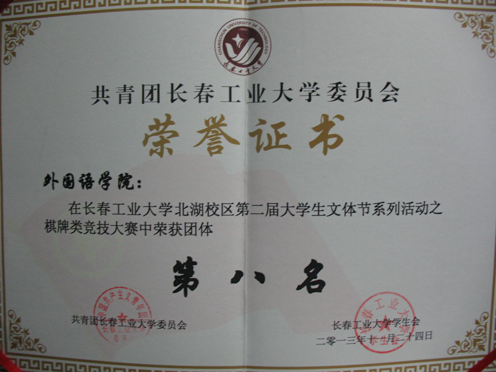 北湖校区第二届大学生文体节系列活动之棋牌类竞技团体第八名。