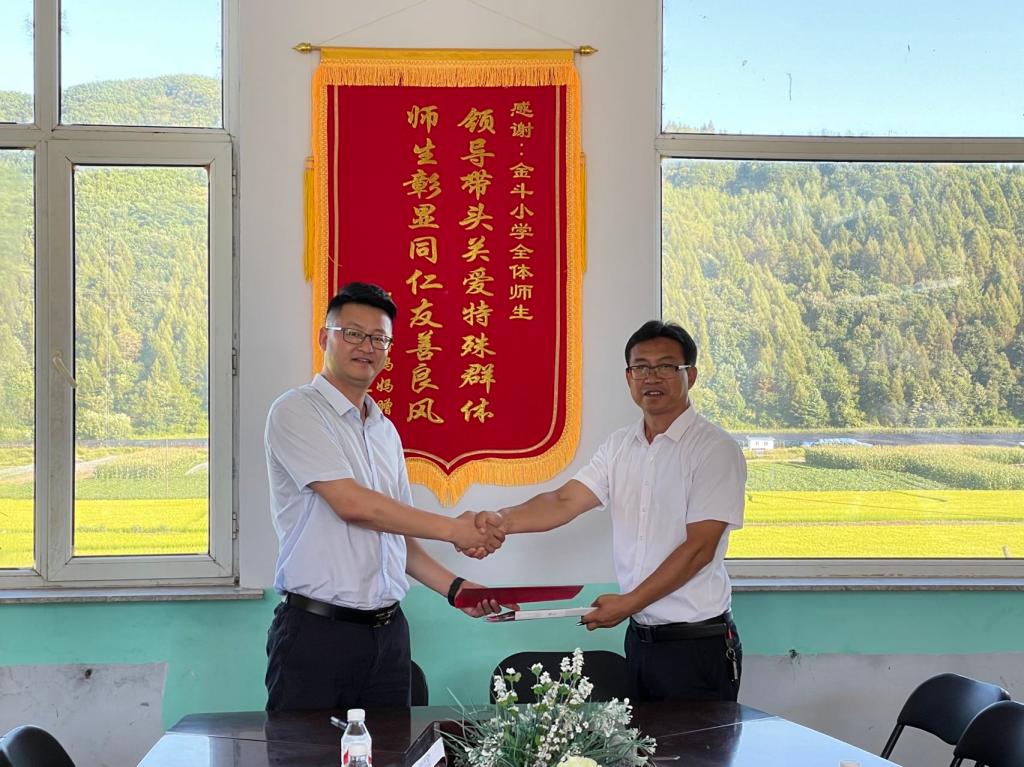 随后,走访团队来到金斗朝鲜族满族乡中心小学,校长李龙介绍了学校的基本情况,王轶和隗英辉校友共同为海棠书屋 大学生就业创业实习基地揭牌,党委副书记于伟代表学院与金斗小学签订了大学生就业、实习、实践基地合作协议,并就学生实习、学业帮扶等方面进行了深入探讨。