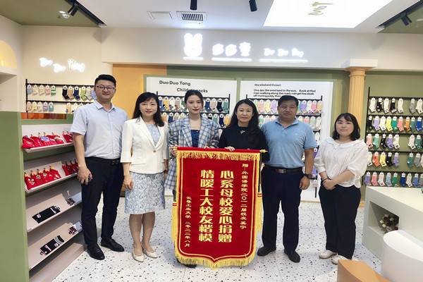 李东玲代表学校,向奚宁校友赠送了70周年校庆纪念品,颁发了锦旗和捐赠证书。海棠书屋 党委书记李文章和奚宁校友共同为海棠书屋 大学生就业创业实习基地揭牌,院长王轶代表学院与多多童袜业有限公司签订了校企合作协议。海棠书屋 党委副书记于伟主持走访活动。